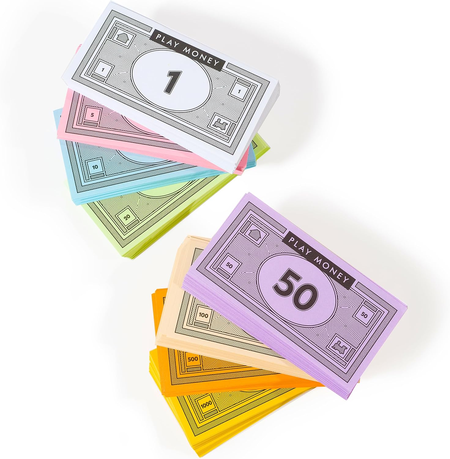 - 8 Colors and 8 Denominations: The Apostrophe Games board game replacement play money comes with 65 of each bill: $1, $5, $10, $20, $50, $100, $500 & $1000. The bills are differentiated with various classic colors: White, Pink, Light Blue, Light Green, Lilac, Beige, Orange, and Yellow.